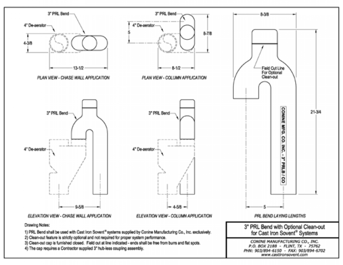 Our new 3" PRL Bend further reduces chase space requirements when used with our 4" De-aerator fitting. The clean-out feature is available as a simple field cut. The coupling is not included.