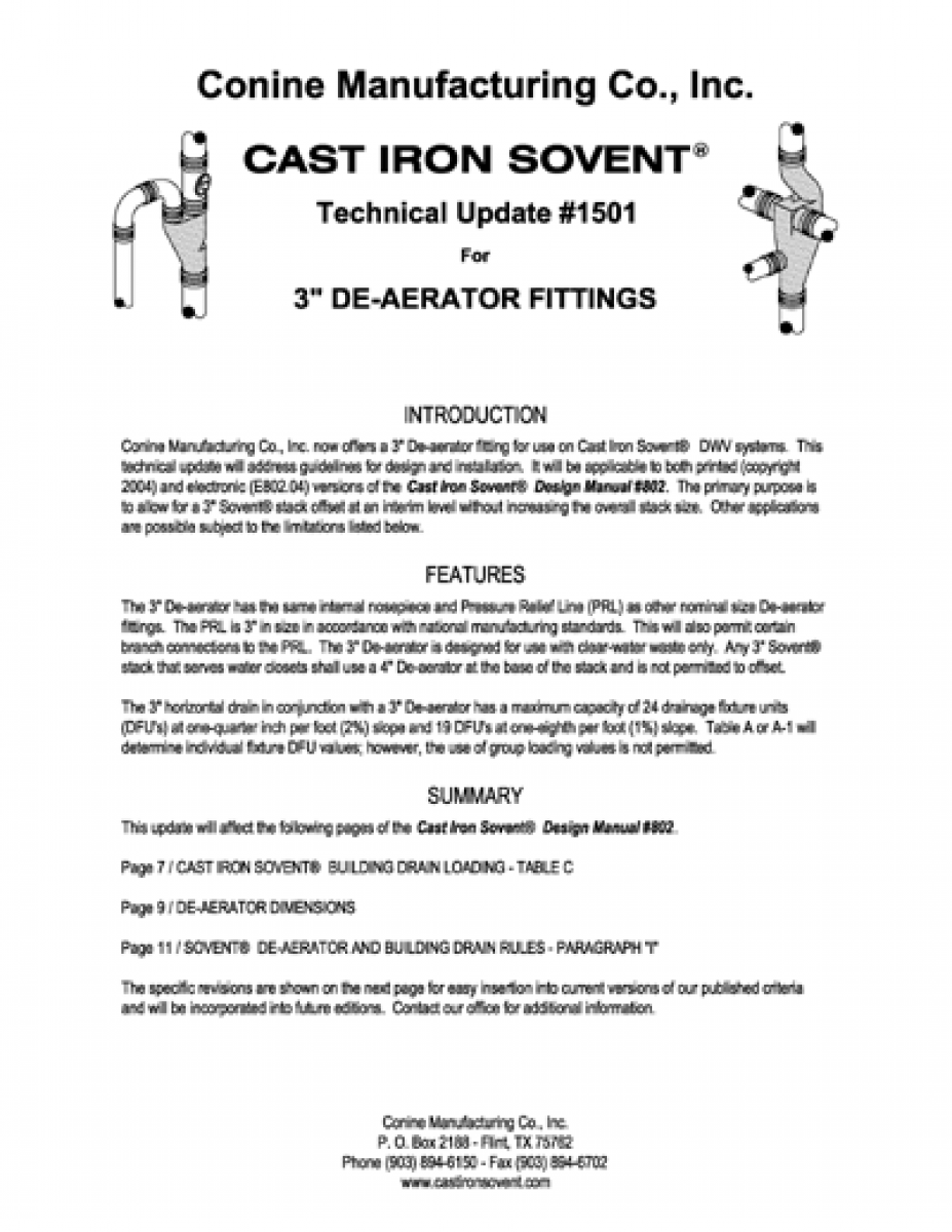 Our 3” De-aerator fitting is now available. This update will address guidelines for design and installation. It’s applicable to both printed (©2004) and electronic (E802.04) versions of the Cast Iron Sovent® Design Manual #802.